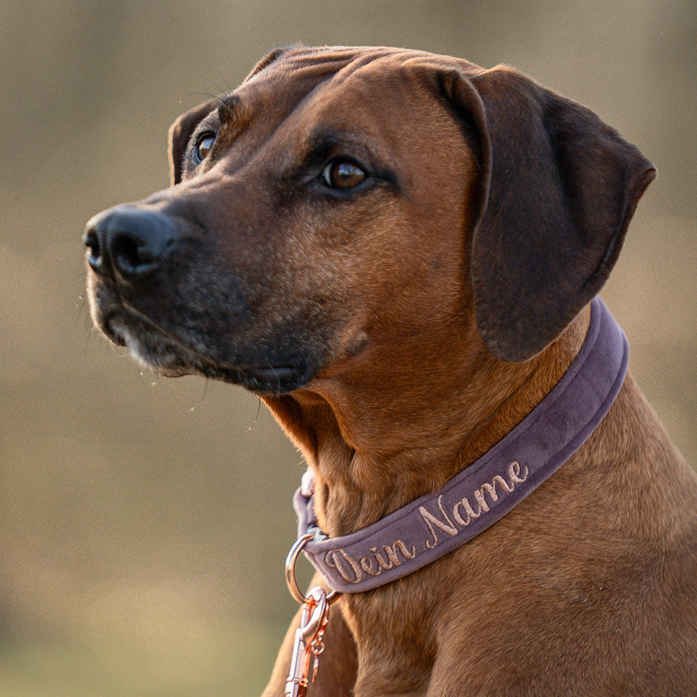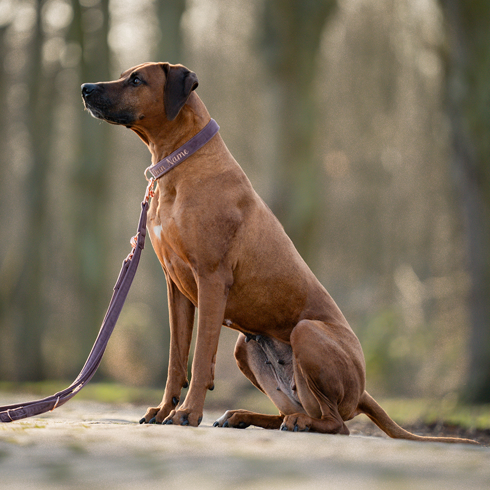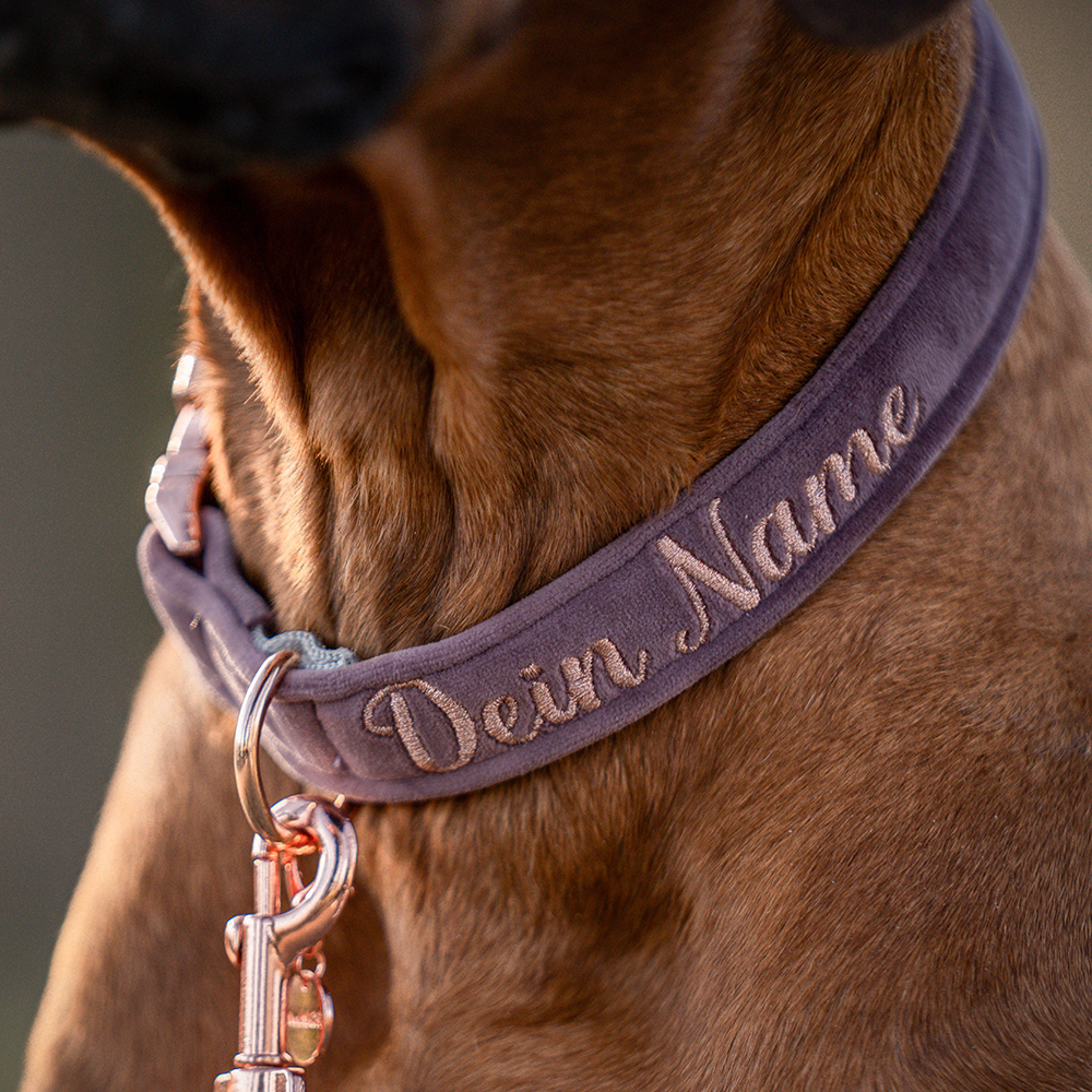 Halsband aus recyceltem Gurtband, das aus alten Fischernetzen, Plastikflaschen und -abfällen gewonnen wurde und nach seinem Leben auch wieder recycelt werden kann. 100% Made in Deutschland. Mit Beschlägen in Rosegold oder Silber.